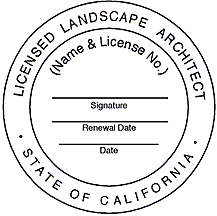 The stamp, as authorized by Sections 5659 and 5673 of the Business and Professions Code and Section 2606 of the California Code of Regulations, may be purchased by the landscape architect from any convenient source, but shall be of the design illustrated here and shall be between one (1) and two (2) inches in diameter.